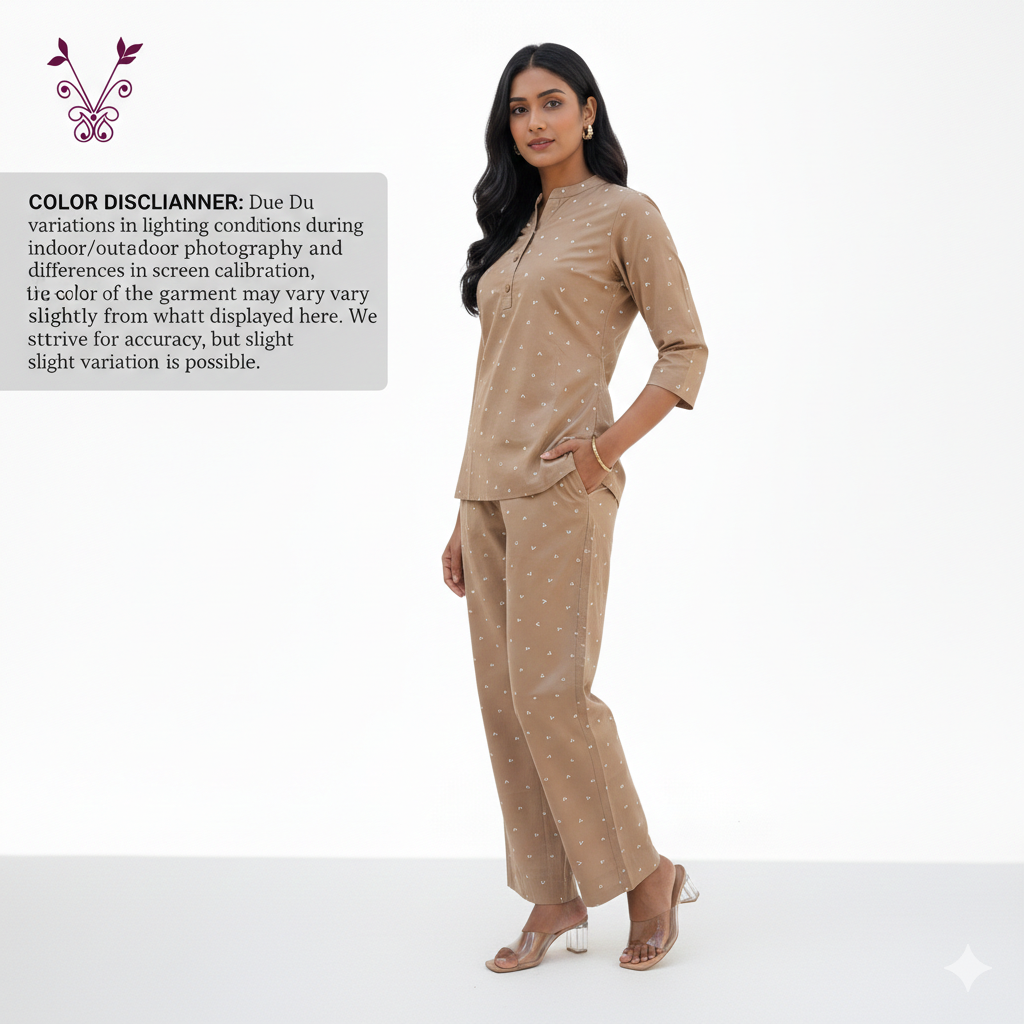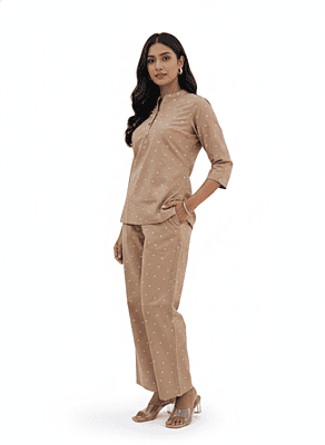 Elevate your everyday wardrobe with our meticulously crafted two-piece Co-Ord set. Designed for the modern woman who values both sophistication and comfort, this ensemble blends traditional motifs with a contemporary silhouette.